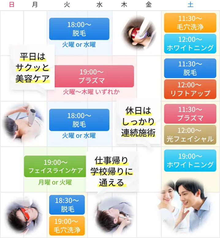 脱毛・毛穴洗浄・ホワイトニングなど、複数メニューを追加料金なしでまとめて利用できます。